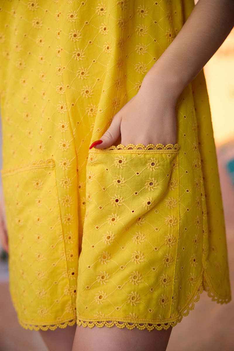 Яркий молодежный комбинезон из шитья. На передней части два накладных кармана. Бретели с возможностью регулировки.