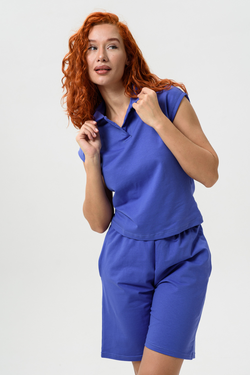 Летний костюм - жилет и шорты. Жилет с воротником "поло" с цельнокроенными подбортами и отстрочкой до линии плеча. Лёгкий лаконичный полуприлегающий жилет со спущенной линией плеча мягко драпируется на линии талии. Шорты с высокой посадкой, пояс прошит на поясной машине. В боковых швах внутренние карманы. Этот стильный костюм подходит для путешествий, прогулок, повседневного использования.